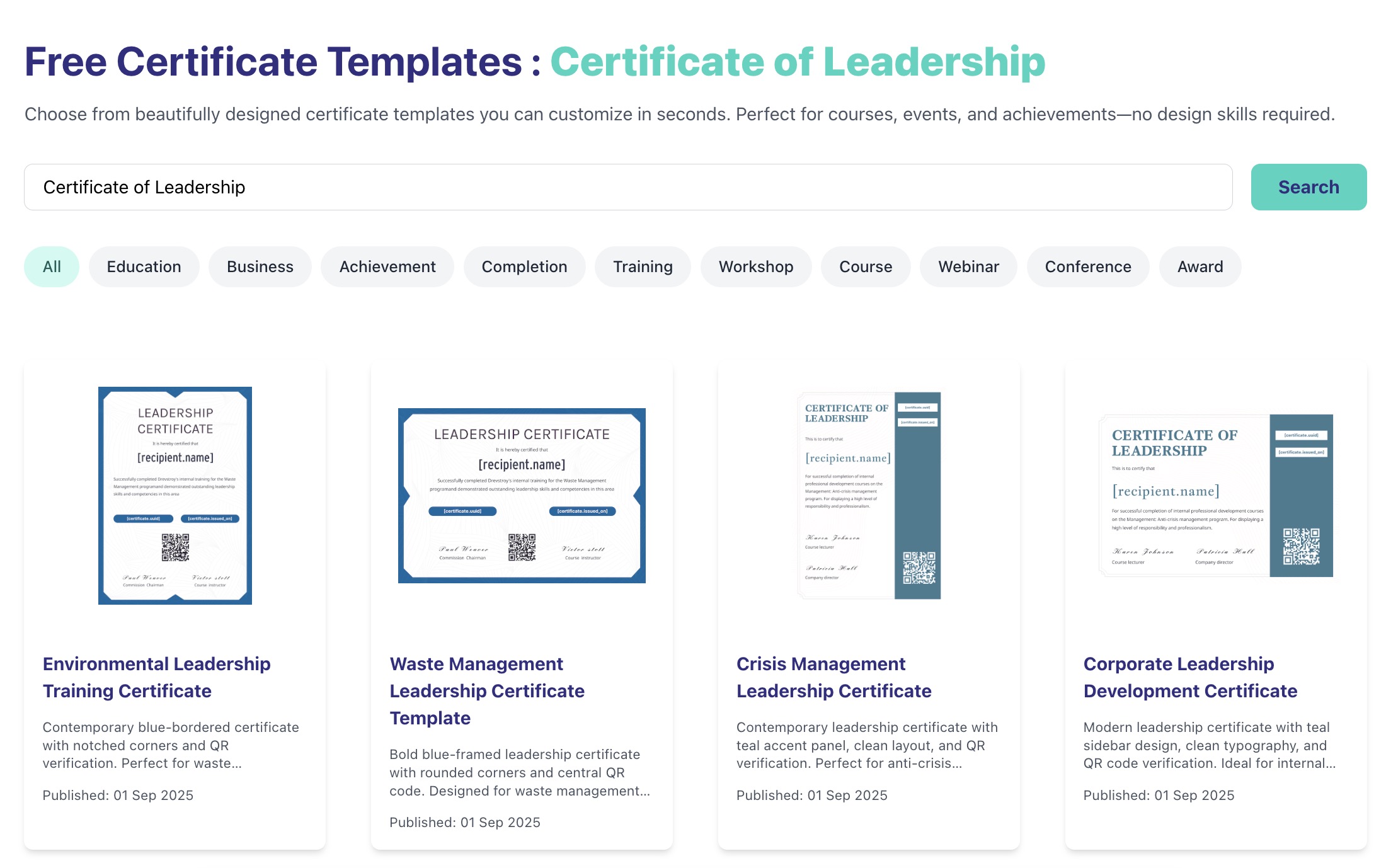 Every example here is ready to drop into a leadership certificate template. Swap in your details — recipient name, organization, dates, role — and you'll have wording that earns its place on someone's wall. Start with a free template and downloadable example if you want to see how these look fully assembled.